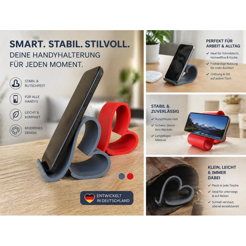 Der herzförmige Handyhalter von Wir-Machen-Deine-Idee ist der ideale Begleiter für Büro, Homeoffice, Empfangsbereich und Alltag. Der kompakte Smartphone-Ständer hält Ihr Handy sicher im Blick, während Sie telefonieren, arbeiten oder Videos ansehen – perfekt für iPhone und Android.